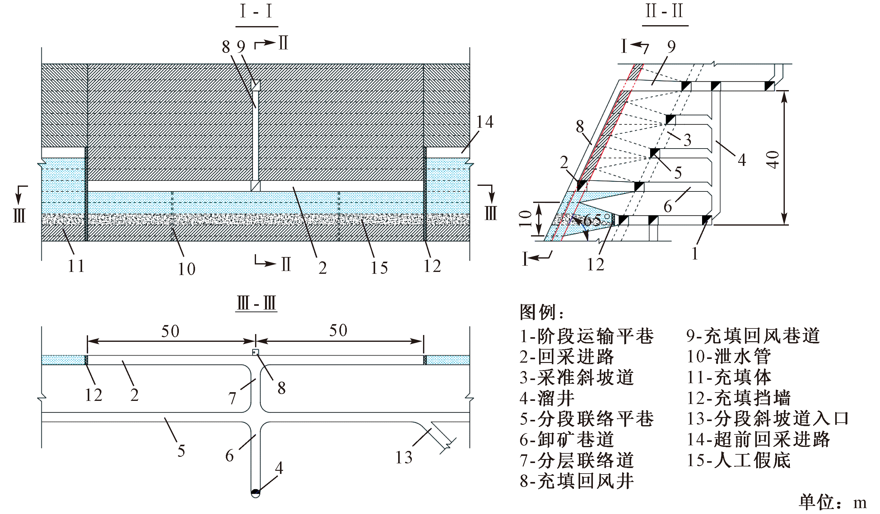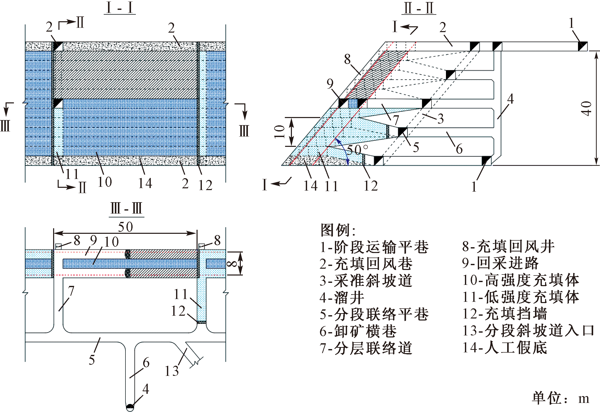 Key words: inclined thin ore body, filling mining method, mechanized upward horizontal layered cut-and-fill method, unclassified tailing, cemented filling