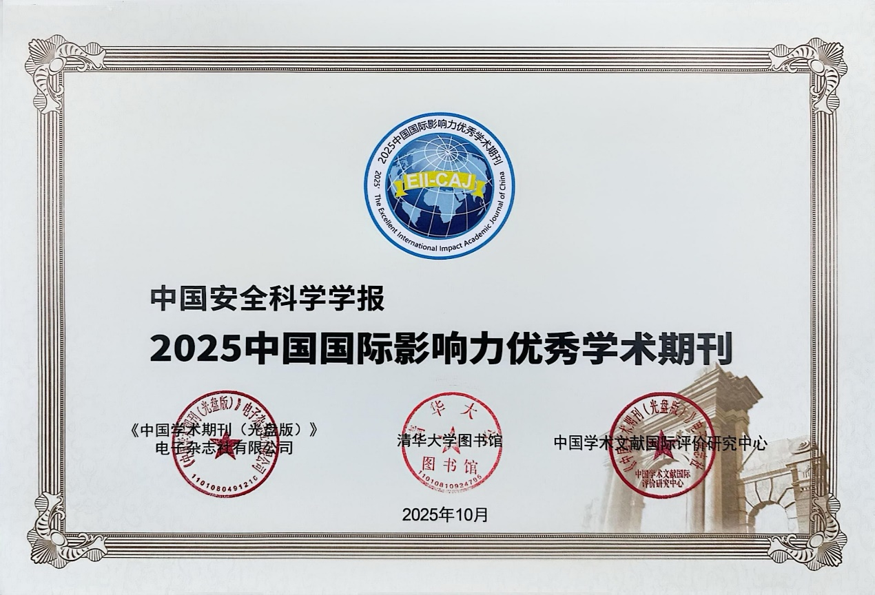 2025年12月11日,由同方知网数字科技有限公司、中国学术文献国际评价研究中心与清华大学图书馆联合研制的《中国学术期刊国际引证年报(2025版)》正式发布。《中国安全科学学报》(以下简称《学报》)入选“2025中国国际影响力优秀学术期刊(自然科学与工程技术?中文)”,是安全科学技术类唯一入选期刊,展现了期刊卓越的国际影响力与传播力。