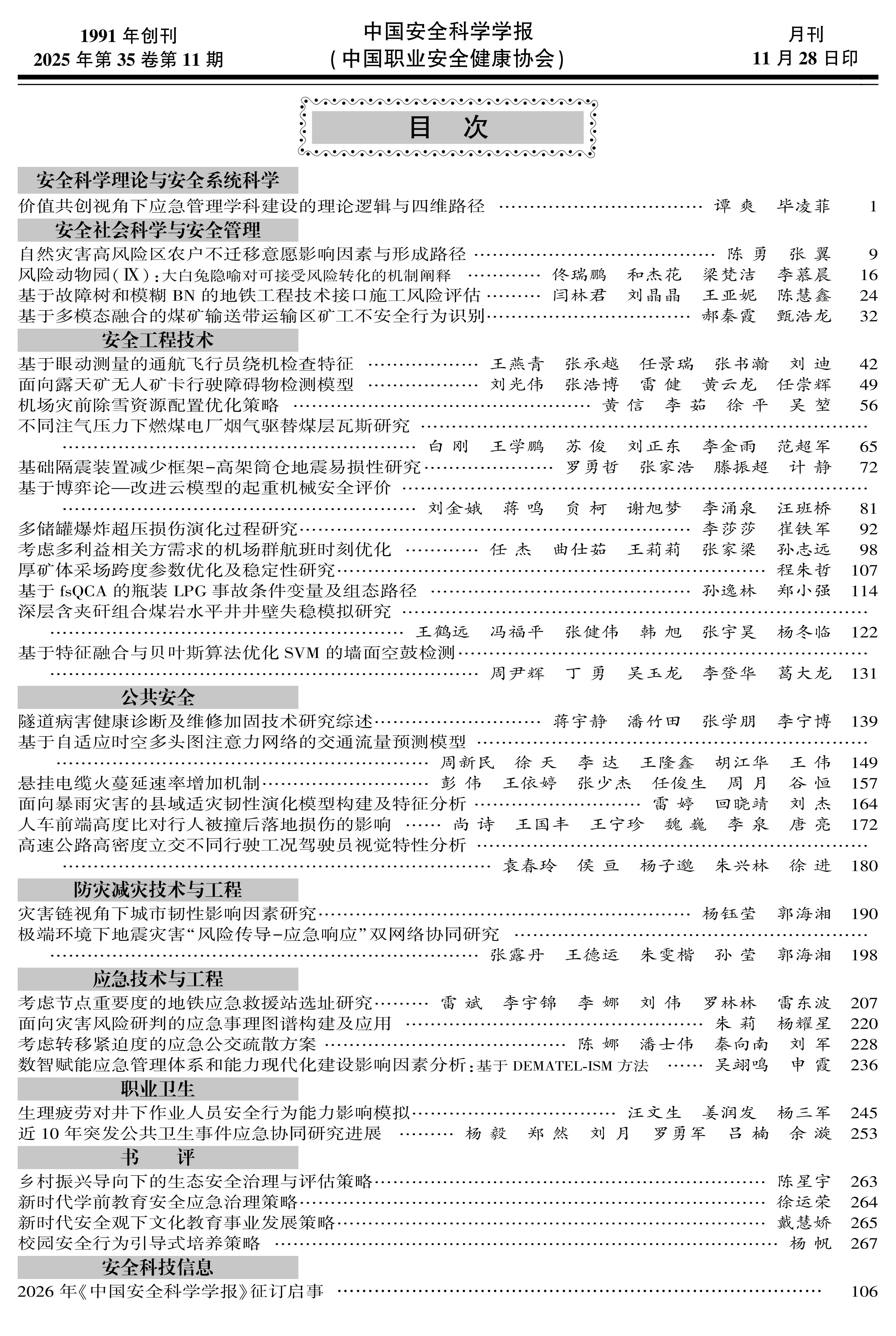 《学报》的稳步发展离不开编委、青年编委专家的悉心指导和帮助、广大作者的潜心创作与读者的长期支持。在此,《学报》编辑部谨致诚挚谢意,并热忱期待内外专家学者继续鼎力相助,踊跃投稿高质量学术论文,携手推动安全科学技术领域的学术创新与国际传播,为筑牢公共安全防线贡献智慧力量。