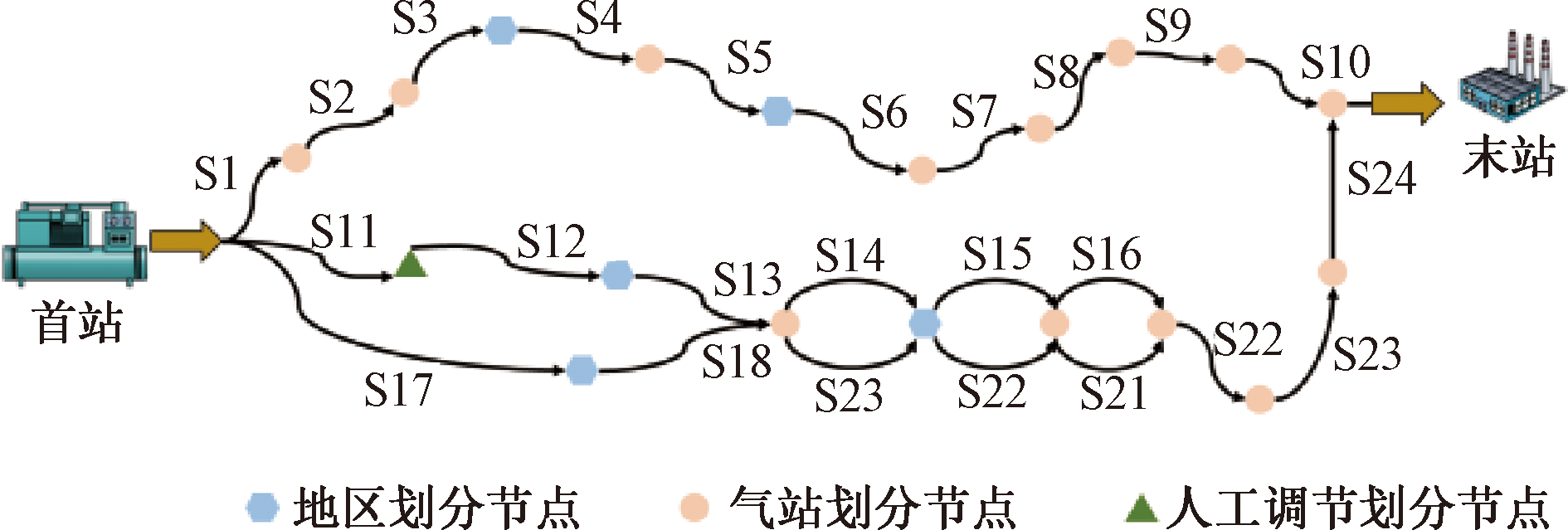 In order to ensure the safe operation of gas pipeline networks and to enable the overall reliability assessment of pipeline systems, a three-level reliability evaluation model "component-segment-pipeline network" was proposed for natural gas pipeline networks. First, the state equations of steel pipe and weld units under different failure modes were established by analyzing the composition of the pipe network line system. Combined with the Monte Carlo algorithm, the failure probability under different failure modes was calculated. Based on fault tree analysis and the minimal cut set theory, a "component-segment" level reliability model was developed, enabling the hierarchical reliability evaluation from components to pipeline segments. Next, the GO method was applied to analyze the topological structure of the pipeline network, and a structural reliability model at "segment-pipeline networ" level was established. The structural reliability of the entire pipeline network was calculated and weak segments in terms of reliability were identified rapidly. Finally, a case study was conducted to verify the accuracy and applicability of the proposed model. The results show that the reliability of pipeline network systems is positively correlated with pipe material strength and wall thickness, and negatively correlated with the diameter-to-thickness ratio and internal pressure. Compared to high-grade pipelines represented by X80, networks composed of lower-grade pipelines exhibit higher sensitivity to external factors, with their reliability being more significantly affected by external disturbances.