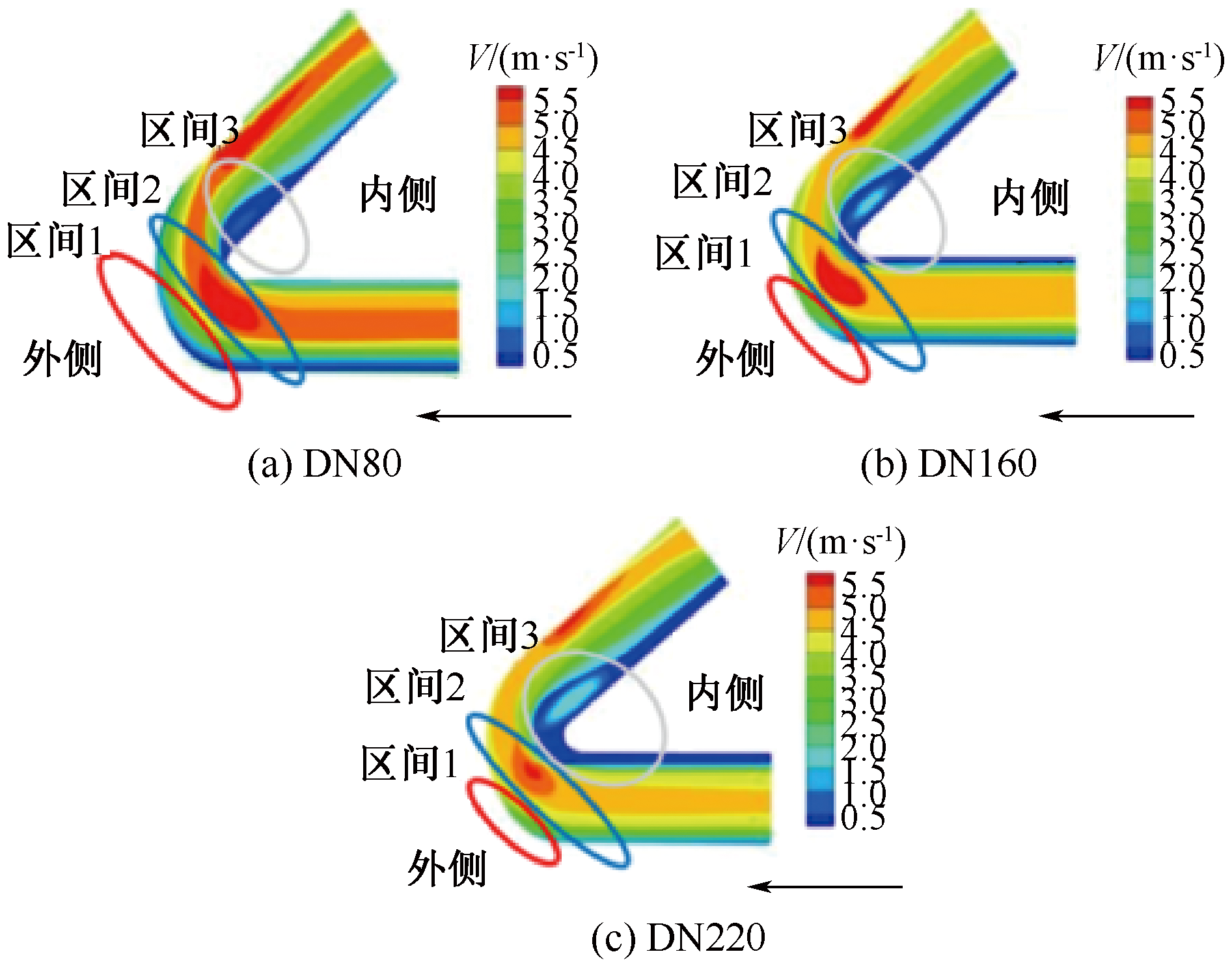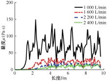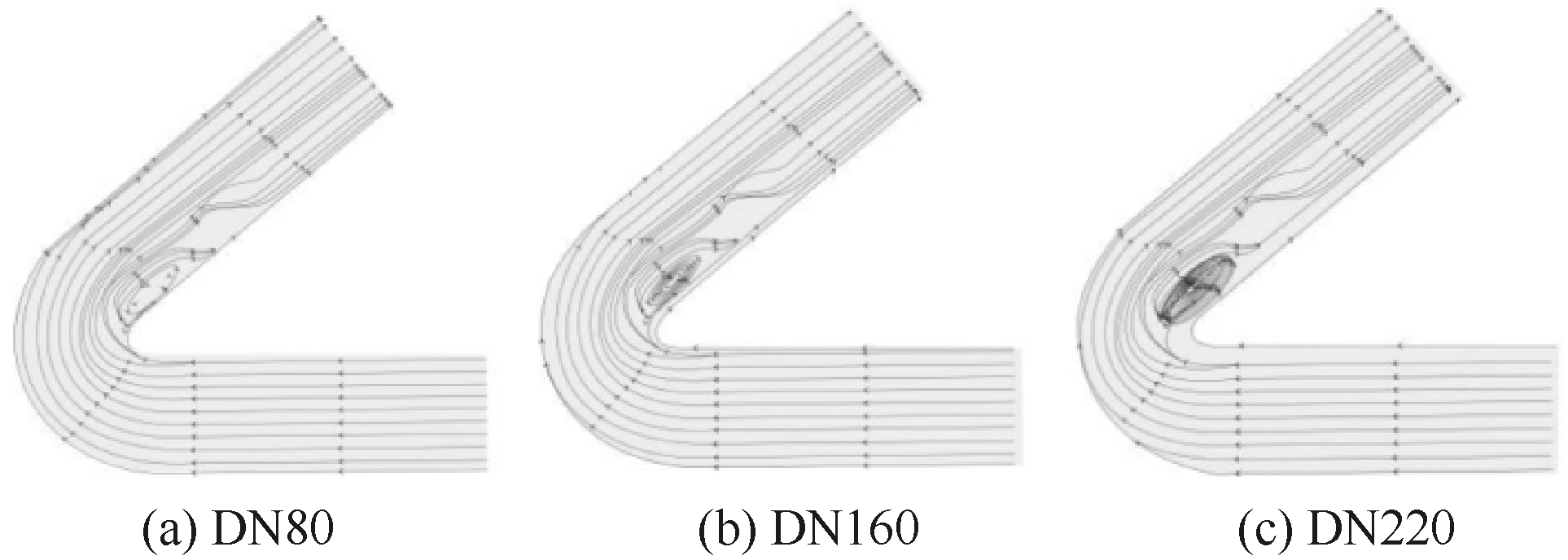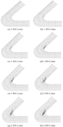 In order to optimize engineering fire-extinguishing technologies, numerical simulation was employed to investigate the effects of flow rate and pipe diameter at the foam inlet on the transport behavior of compressed air foam. In the simulation, the flow rate varied within the range of 1 000-2 400 L/min, and the pipe diameter ranged from DN80 to DN220. Characteristic parameters characterizing foam transport were extracted, including flow field, vorticity, viscosity, and pressure drop. The results show that the velocity of the foam fluid at the elbow forms three regions from the outside to the inside: low-speed, high-speed, and low-speed. However, the flow rate and pipe diameter changes have different degrees of influence on these three regions. Regarding the effect of inlet flow rate, there is a positive correlation between vorticity and inlet flow rate. Additionally, the low-speed region on the inner side of the elbow increases, the high-speed region is squeezed toward the outer wall, and the range of the low-speed region on the outer side decreases. Meanwhile, as the inlet flow rate of the foam fluid increases, the viscosity of the fluid gradually decreases, and the pressure drop first increases and then tends to stabilize. In terms of the influence of pipe diameter, compared with the inlet flow rate, the changes in velocity stratification and vortex near the elbow are relatively slight when the pipe diameter increases. Moreover, the pressure drop inside the pipe gradually decreases with the increase in pipe diameter. When the pipe diameter increases from DN80 to DN220, the local pressure drops decreases by approximately two-thirds.