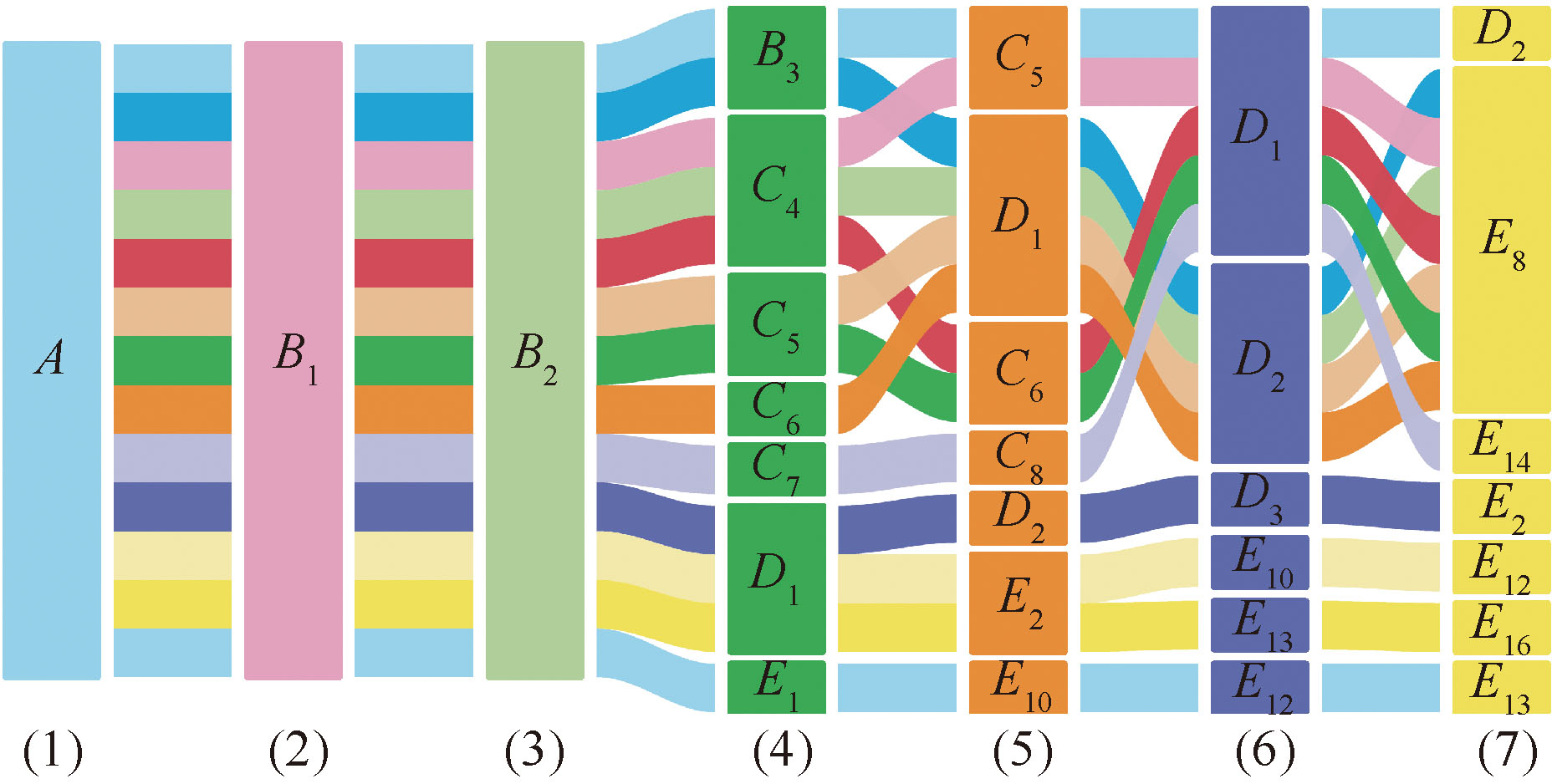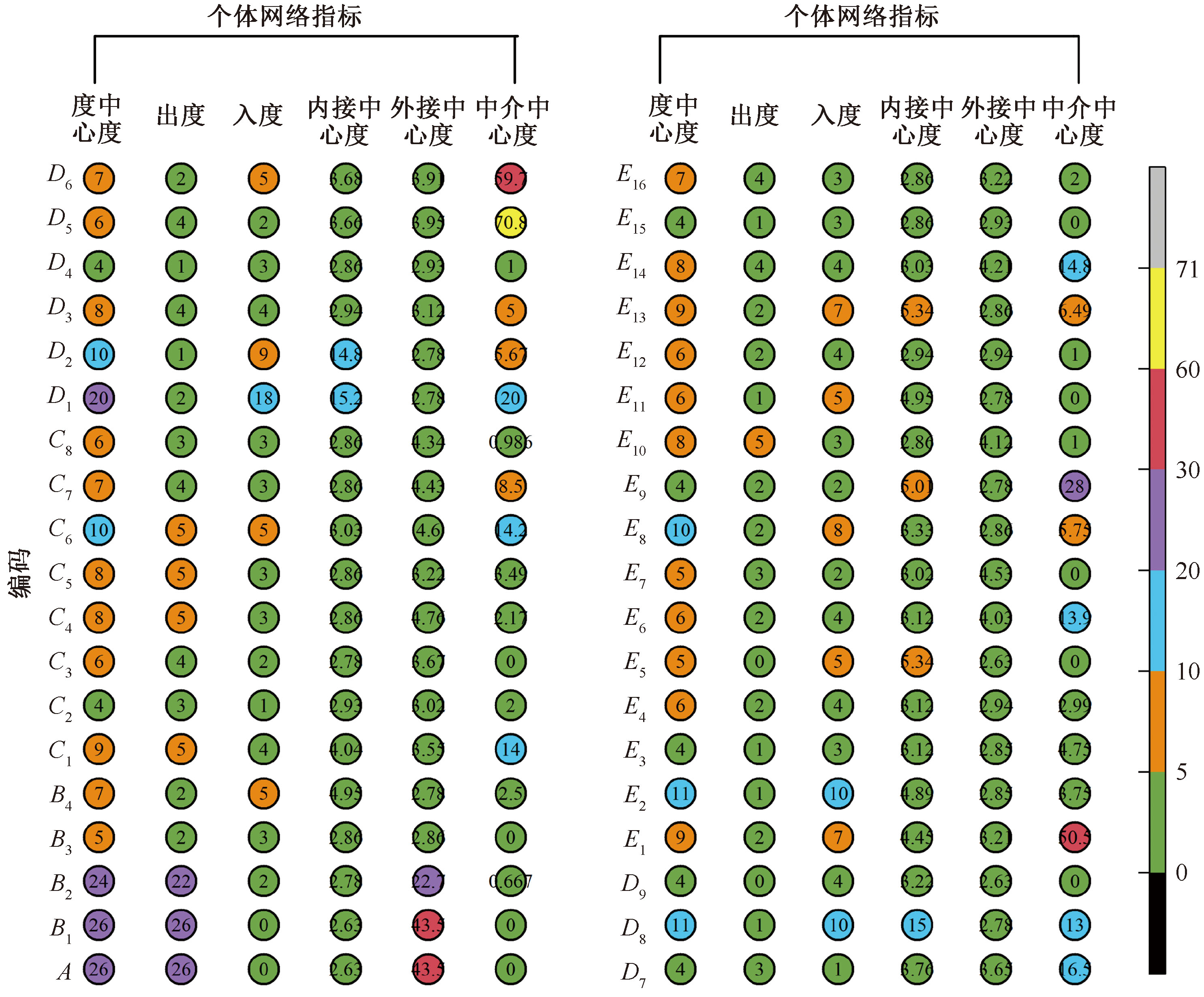 | 终端积累型 | 出度小于均值,入度大于均值 | 灾害影响的汇聚点,反映灾害损失 | D1、D8、E2、E8、D2、E1、E13、D6、E5、E11、E4、B4、E6、E12 |