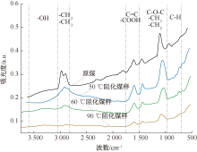 | 主要官能团 | 原煤 | 50 ℃处理抑制煤样 | 70 ℃处理抑制煤样 | 90 ℃处理抑制煤样 | ||||