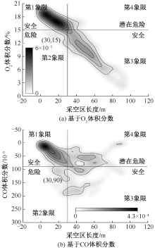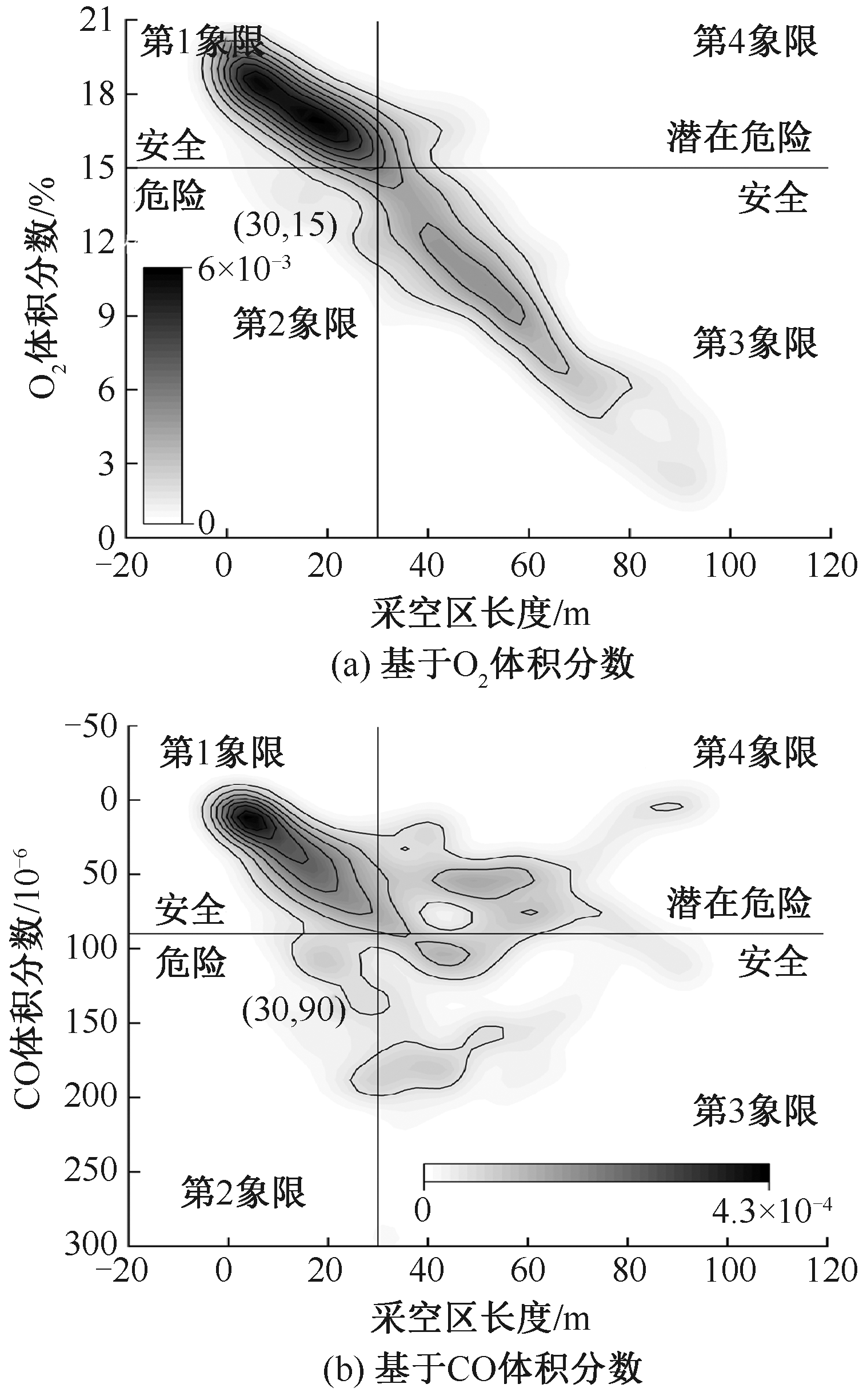 To prevent coal spontaneous combustion disasters in the gob area and precisely delineate hazardous zones, the variation patterns of CO and O2 volume fractions along the gob length were statistically analyzed based on field measurements. Critical warning threshold ranges for spontaneous combustion were established and a gob hazard zoning method based on gas volume fraction kernel density was proposed. The results demonstrate that O2 volume fraction exhibits a linear variation with distinct stages, and the variation rate before the inflection point is lower than that after the point. The CO volume fraction follows a quadratic polynomial variation. The kernel densities of both CO and O2 volume fractions decrease with increasing gob length. Their highest kernel density distributions occur within 0-10m and 0-30m, respectively. O2 volume fraction is more stable before the inflection point but exhibits greater fluctuation afterward. The average upper and lower acceptable limits for O2 volume fraction before and after the inflection point are 3.3% and 6.3%, respectively. The critical CO and O2 volume fraction values for hazard zoning based on kernel density are 0.009% and 15.1%, which divides the gob area into four quadrants and three risk levels (safe, potentially hazardous, and hazardous).
